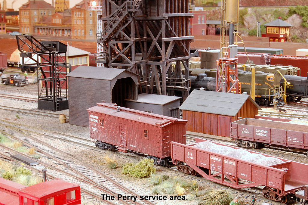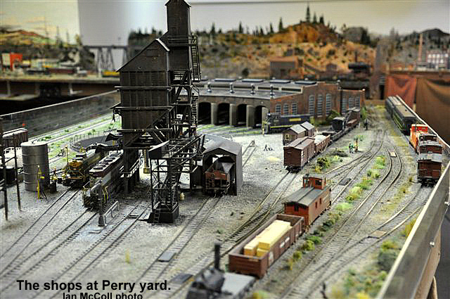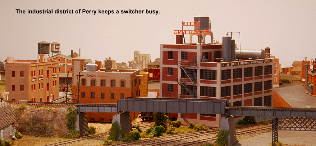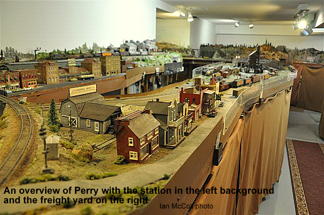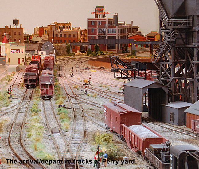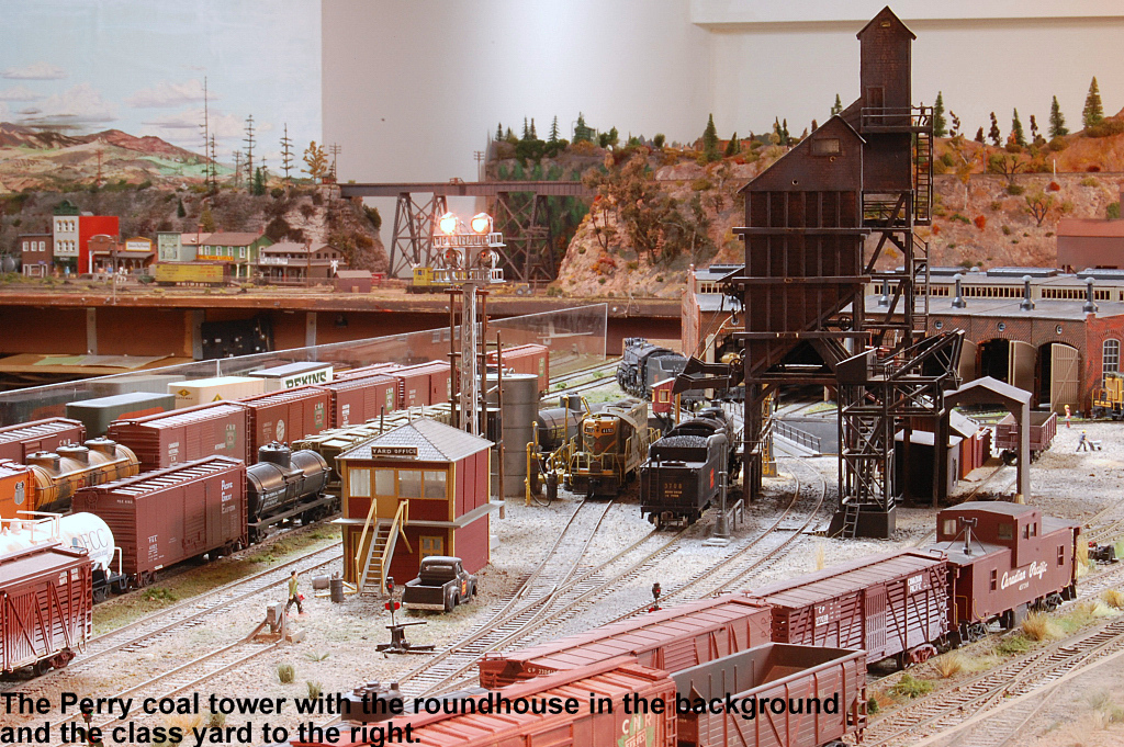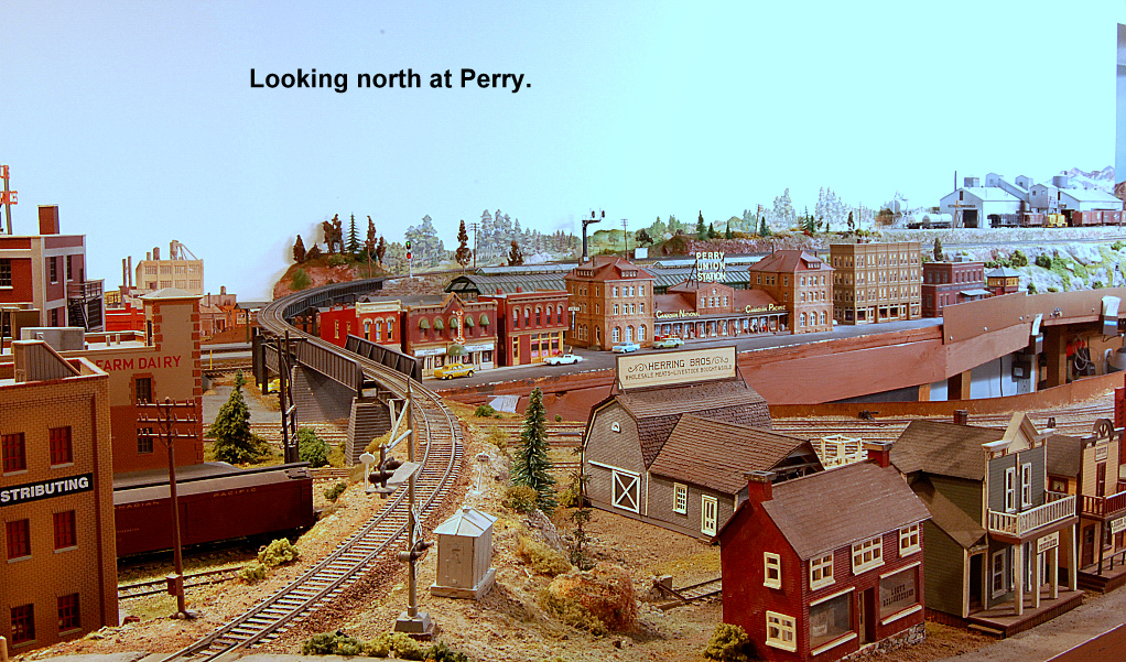 From east end staging the mainline exits a tunnel and enters Perry. All trains are worked at Perry including passenger trains. Locomotives go for service, blocks are taken off and more are added. There are 2 locals that work out of Perry and the yardmaster has lots of industry to switch.