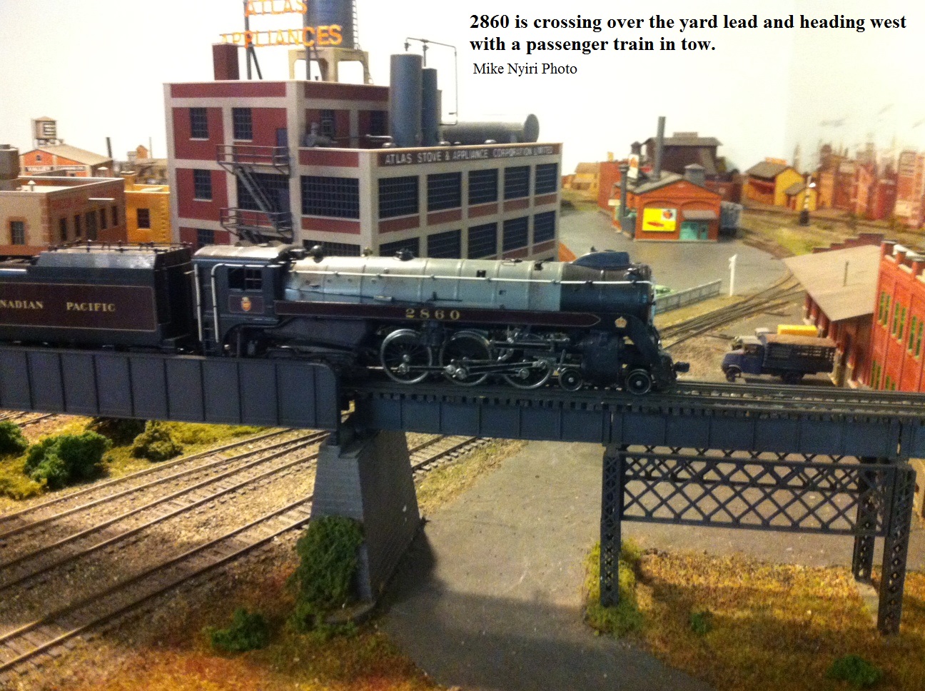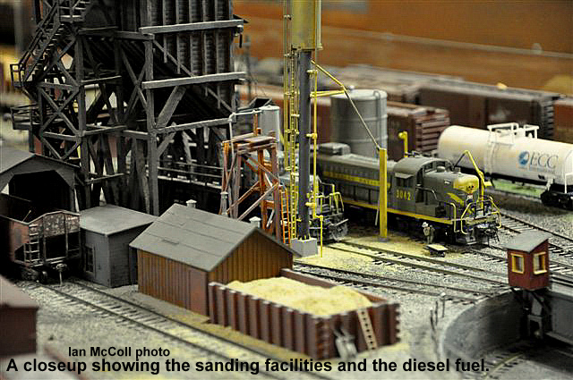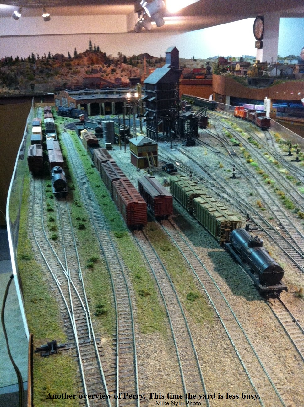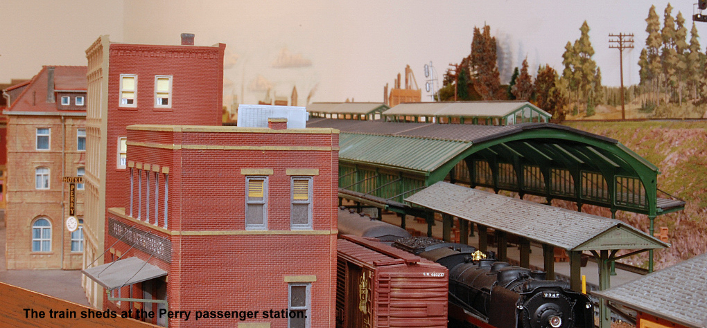 From east end staging the mainline exits a tunnel and enters Perry. All trains are worked at Perry including passenger trains. Locomotives go for service, blocks are taken off and more are added. There are 2 locals that work out of Perry and the yardmaster has lots of industry to switch.