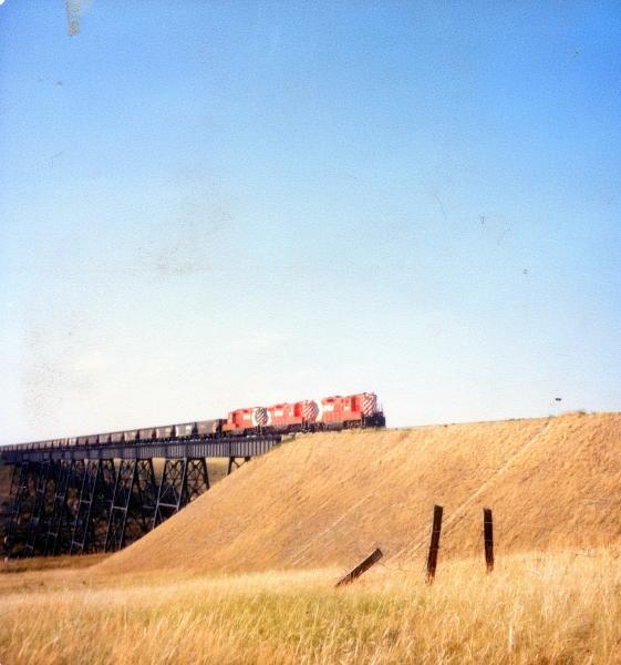 There are a number of tall steel viaducts on the Canadian Pacific in Alberta. An eastbound train is crossing the bridge at Carmangay.