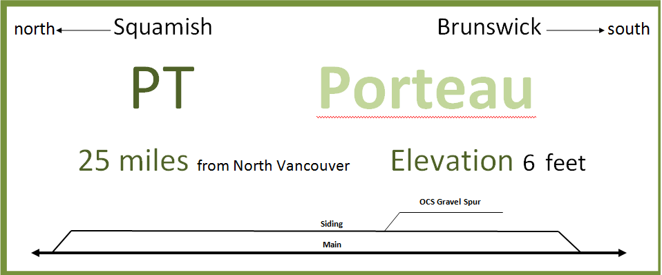 Porteau Next up traveling north we come to Porteau. There was a Ballast spur here in my era. The siding is 1116 feet It is a scenic spot on the sea to sky highway although the dock was not there in 1982.