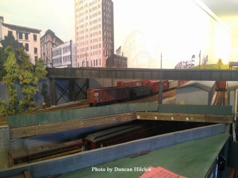 This photo is looking under the Burrard bridge. We can see the switcher pulling cars from the Drake Street Yard yard.